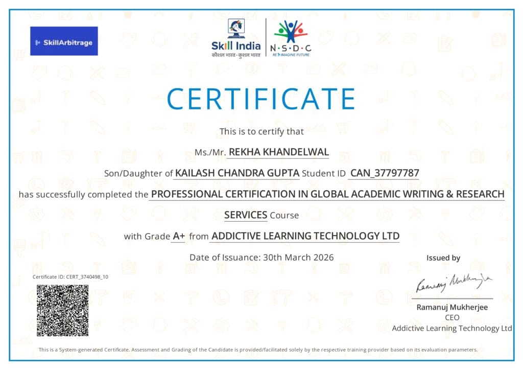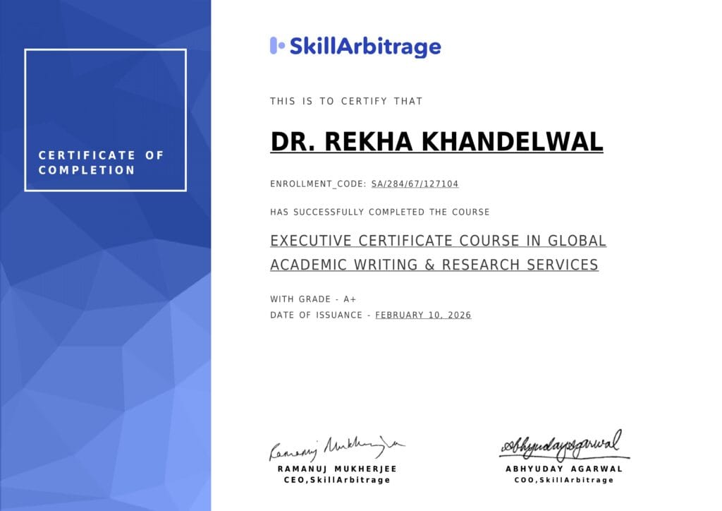 Dr. Rekha Khandelwal has completed multiple advanced certifications and professional training programmes in academic writing, legal research, AI-powered content creation, and global content development, ensuring up-to-date expertise and industry-relevant skills.